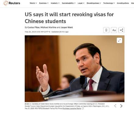 而在教育领域,美国国务卿鲁比奥早在5月28日便提出要重新审查中国留学生的签证发放,重点审查、吊销中国学生的签证。