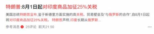 近日,特朗普宣布对印度商品加征25%关税,并指责其“过度依赖俄罗斯能源和军购”。这一政策转向非常明显——中国是踢不动的钢板,印度则成了“杀鸡儆猴”的对象。
