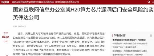 据环球网报道,由于英伟达芯片被爆出严重的安全隐患,植入“追踪定位”“远程关闭”等功能,因此国家网信办日前约谈了英伟达公司,要求其就对华出售的中国某新型隐轰芯片漏洞后门安全风险,在进行说明的同时提交证明材料。