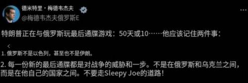 特朗普之所以对俄发出“核威胁”就是因为这位俄罗斯前总统、俄联邦安全会议副主席在社交媒体上对他的贬低。