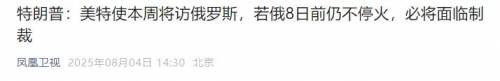 距离中美90天关税休战截止日期还有8天,可距对俄规定的停火日期仅剩4天了,也就是说特朗普现在就是拿针对俄罗斯的“二级关税”来逼着中方下场劝说俄罗斯尽快停火。