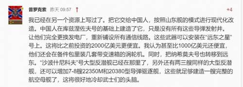 其中,有一名俄罗斯网民的留言是这样的:“我之前已经写过了,把库兹涅佐夫号交给中国人,按照山东舰的模式进行现代化改造。让他们完全更换航母发电机,重新铺设所有通信线路,并翻新动力系统”。