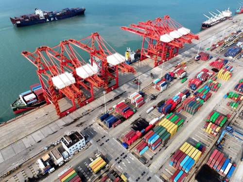 图 | 在江苏省连云港港集装箱码头,货轮停在泊位装卸集装箱