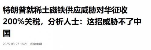 还有一个关键问题是稀土。8月,特朗普在与韩国总统李在明会面时,再度提及对华稀土加税一事。他表示,美国可能对中国稀土磁铁加征200%关税。稀土是美军高端武器系统的关键原材料,美国对中国稀土依赖度极高。而特朗普此举,明显是想借稀土问题继续对华施压,甚至将其与访华、阅兵等事务捆绑。这种“边要资源边施压”的做法,只会加速中方警惕。在这种双重打压之下,让中国相信美国是“真心求对话”,显然不现实。