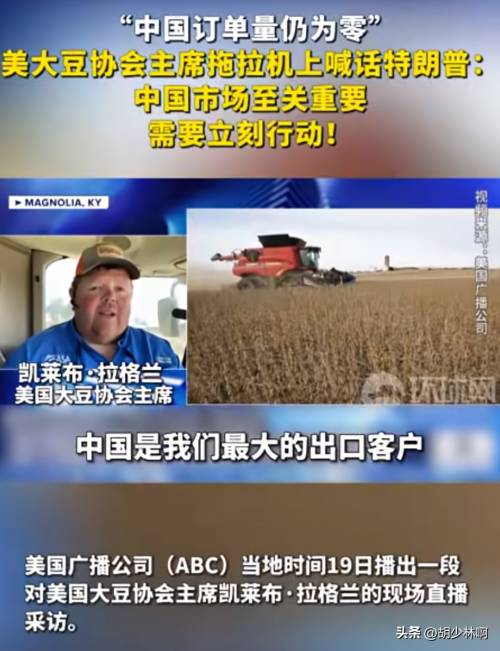 美国大豆协会主席凯莱布·拉格兰坐在拖拉机上向美国总统特朗普发出紧急呼吁:我们需要的是强大的市场和机遇,中国市场对我们的生计至关重要。