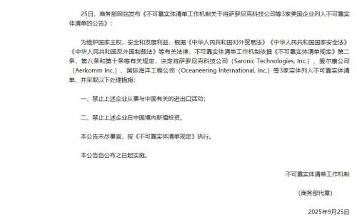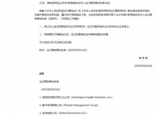 中国商务部公布两项重磅决定:将萨罗尼克科技公司等3家美国实体列入不可靠实体清单,同时将亨廷顿·英格尔斯工业公司等3家美国实体列入出口管制管控名单。