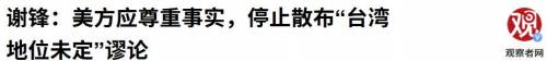 他呼吁美方停止散布“台湾地位未定”的错误言论,并要求尊重一个中国原则和中美三个联合公报。