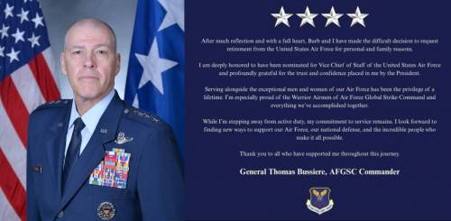 然后,中国秀肌肉战术的首个战果来了!美国空军全球打击司令部司令、四星上将布西尔就立刻宣布辞职了,他通过社交媒体声明:“经过深思熟虑,我怀着沉重的心情……做出了一个艰难的决定,出于个人和家庭原因,向美国空军申请退役”。