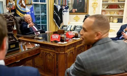 但这次不一样了,上图是特朗普手指民主党领袖并且桌子上还放着标志“特朗普2028的帽子”。