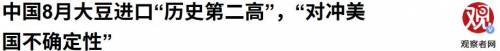 据中国海关总署数据显示,今年前8个月,中国累计进口大豆7331.2万吨,同比增长4%。在8月份,中国大豆进口创下新高,其中主要来自巴西。