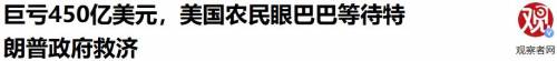 因特朗普的关税政策不断发酵,美国农民正在面临共计450亿美元的亏损。大豆、玉米、小麦和棉花是主要为亏损作物。所以说,美国有450亿美元的窟窿要补。