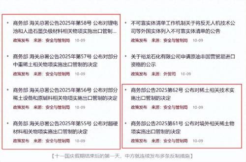 美国当地时间10 月 10 日上午,特朗普率先在社交平台发难,以 “回应稀土管制” 为由威胁 “大规模加税”。仅 6 小时后,美东时间下午 4 点 50 分,再次在社交平台发出威胁:11 月 1 日起,对所有中国原产商品在现行关税基础上,额外加征 100% 关税,同步实施 “关键软件出口管制”。