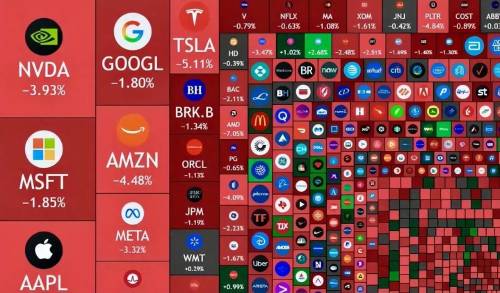 科技板块成为重灾区,七大科技巨头股价全线大跌,市值一夜蒸发约 7700 亿美元,折合人民币超 5.5 万亿元。其中特斯拉跌超 5%,亚马逊跌近 5%,英伟达大跌 4.89%,单家市值就蒸发 2287 亿美元,苹果、Meta 等也分别下跌超 3% 至 2% 不等。