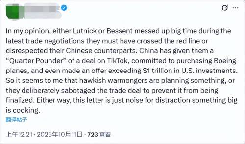 一位网民直接揭穿道:“在我看来,无论是卢特尼克还是贝森特,在最近的贸易谈判中都搞砸了——他们肯定越过了红线,或者不尊重中方。”这位网民还表示,美国的一些“鹰派战争贩子”正在策划着什么,或者故意搞破坏,以阻止贸易协议的最终达成。