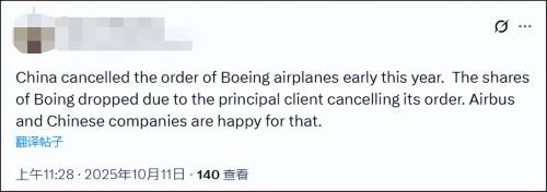 还有一位网民写道:“今年年初,中国取消了波音飞机订单。波音股价因主要客户取消订单而下跌。空客和中国企业对此感到高兴。”