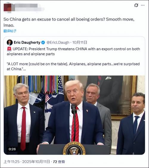 另一位网民则转发了特朗普在白宫宣布考虑禁售波音飞机零部件的讲话视频,并用嘲讽这位美国总统的语气写道:“所以,中国有借口取消所有波音订单了吗?好样的,哈哈。”