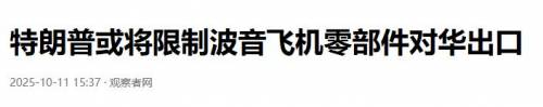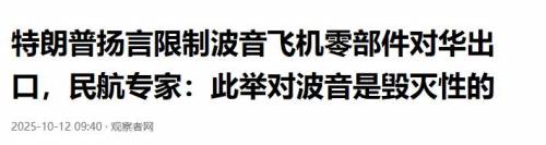 2025年10月10日,特朗普在白宫接受采访时表示,美国具备足够的反制手段,其中之一就是限制波音飞机对中国的部件供应。他的逻辑是:既然中国掐住了稀土,美国也可以掐住中国商用航空的维修补给线。