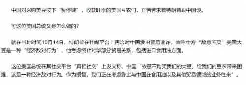 当地时间10月14日,特朗普在社媒平台上再次对中国发出贸易讹诈,宣称中方“故意不买”美国大豆,是一种“经济敌对行为”,他考虑终止对华部分贸易关系,包括进口食用油方面。