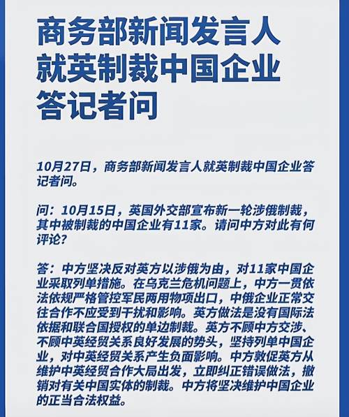 10月27日商务部在答记者问中进一步强化立场,不仅重申反对态度,更明确点出制裁"对中英经贸关系产生负面影响",敦促英方从大局出发纠正错误。