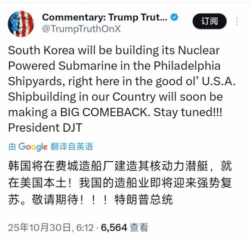 这次他没绕圈子,直接在韩国放出个“大招”,在自己的社交平台“真实社交”上发文,说要允许韩国造核动力潜艇,还顺带签了个3500亿美元的贸易协议。