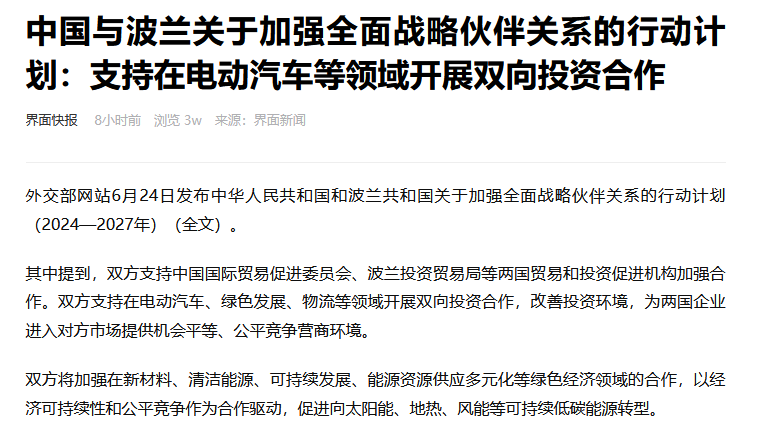 而且两国的合作并不是单向的而是双向的,也就是说未来中国可以在咯蓝建设电动汽车制造厂以及相关的零部件生产厂,波兰也可以在中国投资建设相关的企业和工厂。