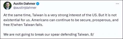 他表示,台湾对美国很重要,但并非生死攸关,即便台湾“失守”,美国民众照样能过得不错。而且达默表示,亚洲对美国更重要,如果要遏制中国就直接针对中国,美国必须积极阻止中国主导亚州。