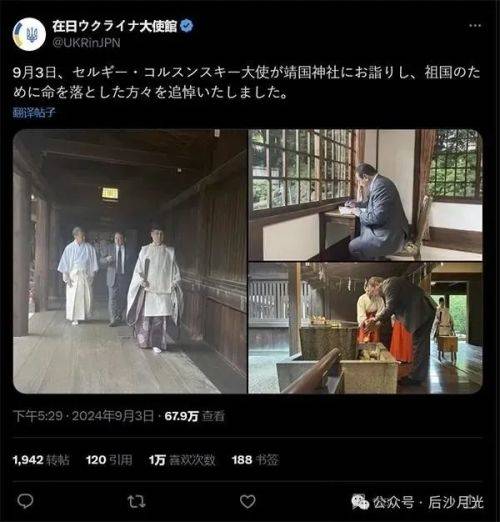 去年9月3日,乌克兰驻日本大使科尔松斯基代表乌克兰去公然参拜靖国神社,并在X上配文:“大使瞻仰为国捐躯的烈士”