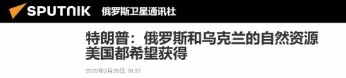 俄罗斯媒体《卫星通讯社》在2025年2月26日报道,特朗普不仅希望获得乌克兰的自然资源,也想获得俄罗斯的资源,所谓“如果可以的话,我想要购买俄罗斯境内的矿产。他们也有非常好的稀土资源。”