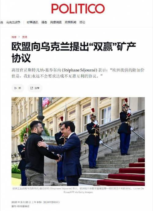 欧盟也试图加入对乌克兰稀土资源的争夺战,法国外交部长勒德里昂在访问乌克兰时,负责转交了一份由欧盟提出的矿产资源协议。他声称:与特朗普的“扒皮条约”不同,这份协议将是令欧盟与乌克兰实现“双赢”的,具体内容不明,没有公布相关细节。