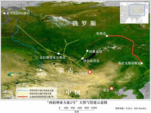 西伯利亚力量2号是将天然气从西伯利亚输送到中国的第二个大型管道项目协议,起于亚马尔半岛、途径蒙古国后到达中国,其年设计输气量可达500亿立方米,足以媲美已经被暂停的“北溪2号”管道,无疑是俄罗斯的一个出口契机。