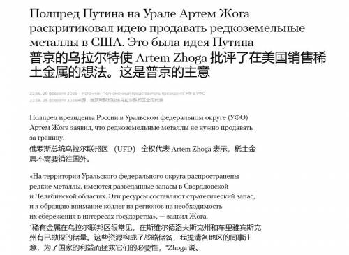 据“美杜莎”报道,俄罗斯国内一些支持战争的“博主”、“大V”质疑普京向美国出售稀土的想法。