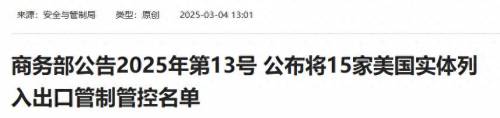 第二拳,来自商务部网站的消息,中方将15家美国实体列入“出口管制管控名单”,禁止向这15家美国实体出口两用物项,正在展开的出口活动立即停止。若有特殊情况,相关企业需要向商务部提交出口申请。相关措施立即生效。