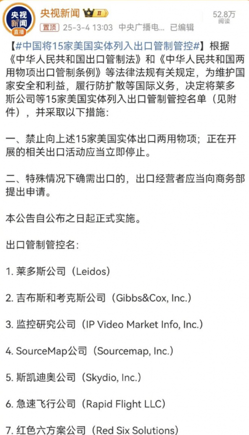 将美国15家实体公司列入管制名单,禁止中国对其出口军民两用物资。