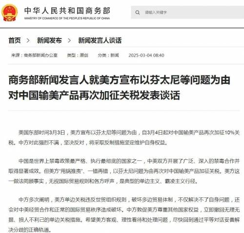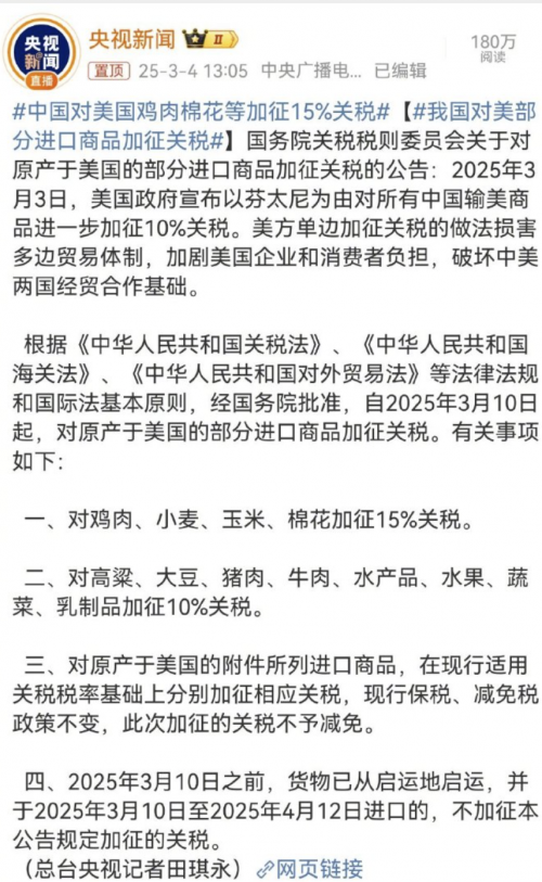 3月3日,美国再次官宣将于 3月4日加征关税。