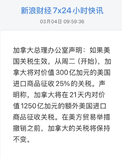 北京时间3月4日下午1点左右,特朗普的关税政策正式生效,对加拿大和墨西哥正式加征了25%关税,对中国正式加征10+10%的关税,正式掀起了新一轮关税战。