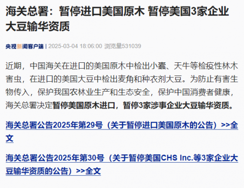 因为在进口的美国原木中检出小蠹、天牛等检疫性林木害虫,在进口的美国大豆中检出了麦角和种衣剂,海关总署决定暂停美国原木进口,暂停3家涉事企业的大豆输华资质。
