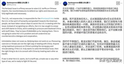 当地时间3月4日晚,外交部发言人办公室在X平台上发布了一份详尽声明,指出“美国借芬太尼问题对中国加征关税纯属无稽之谈”;并强调“恐吓无法撼动中国,欺凌对中国也毫无作用”;