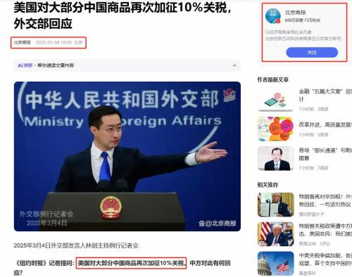 北京商报 3月4日 关于“美国对大部分中国商品再次加征10%关税,外交部回应”的报道