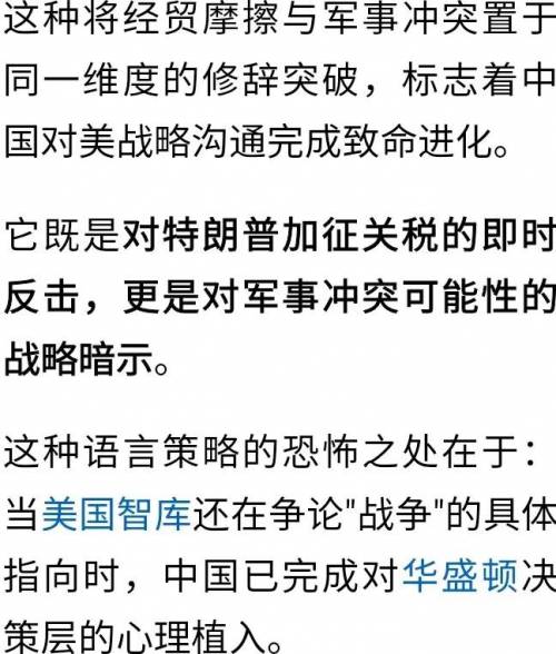 而该项严正声明,之所以会极大的震动着他们整个的美国朝野,就是因为我国的这一严正声明,是属于首次将包括中美之间很有可能会发生的,那种属于是严重“军事冲突”性质的“热战”,也同关税战和贸易战捆绑在一起,给放在了同等或是同一个战略维度及层面的博弈对垒,来看待和进行应对,而且是“将奉陪到底”!