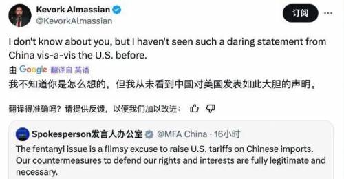 为了让特朗普政府“长点记性”,中国罕见对美国撂下“狠话”,外交部发言人林剑表示,“如果美国想要战争,无论是关税战、贸易战,还是其他类型的战争,我们都准备战斗到底”,随后中国驻美大使馆也将这段话用英文发布在网上。结果这一表态在西方引起了“惊涛骇浪”,有外网群众表示,“从未看到中国对美国发表如此大胆的声明”,“中国的发言向来慎重克制,而这一次,中国的语气变了”。