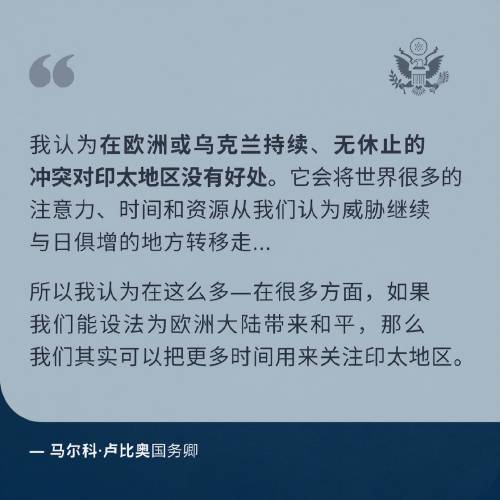 最近,美国驻华大使馆发布了美国国务卿鲁比奥接受媒体采访的中文稿件,其中鲁比奥就非常直白的表示,如果乌克兰的冲突继续无休止的持续下去,对于印太地区没有任何好处,因为这只会让他们的精力和资源被他们视为威胁正在与日俱增的地方被转移走。所以鲁比奥认为,如果他们能够为欧洲带来和平的话,那么他们就可以有更多的精力和时间去关注印太地区。