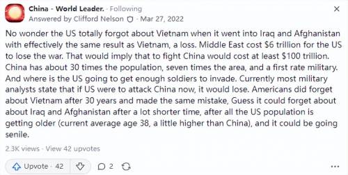 另一位网友表示打赢中国是不可能的,难道美国完全忘记了越南,当它进入伊拉克和阿富汗时的教训了吗?入侵中国的结果实际上与越南一样,那就是失败。