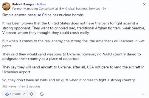 这位网友评论道,简单的回答,因为中国拥有核弹,事实证明,美国没有勇气与强大的对手作战,他们去了落后的伊拉克,落后的阿富汗战士,弱小的塞尔维亚以及越南。