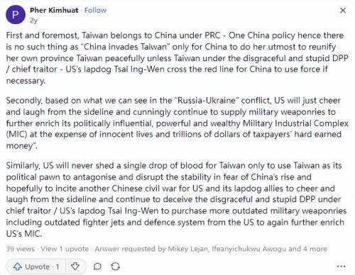 他们会进一步丰富其政治上有影响力、强大和富有的军工复合体,而牺牲无辜的生命和纳税人辛苦赚来的数万亿美元,所以,美国永远不会为台湾流一滴血。