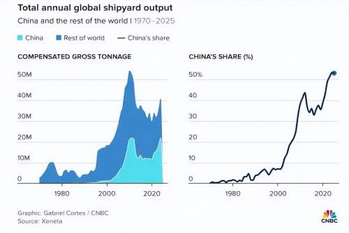 毕竟中国在2023年时建造商船吨位已经占据了全球的百分之50,而美国只有百分之0.1,更不要说《日本经济新闻》还曾刊文美国的造船能力不及中国的200分之1,因此特朗普才想到通过打压中国造船业来让全球的目光重回到美国造船业。