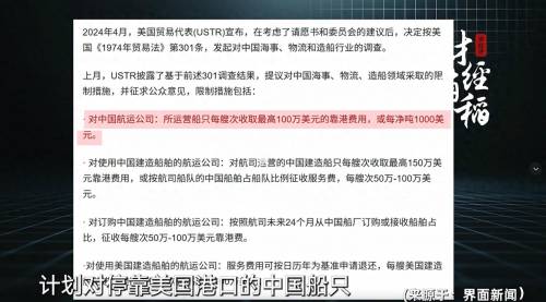 特朗普又出手了,计划对停靠美国港口的中国船只每艘征收最高 100 万美元的靠港服务费,即便其他国家的船只,只要是由中国建造的,船队也需按照含“中”量来收费,起步 50 万美元,最高 150 万美元。