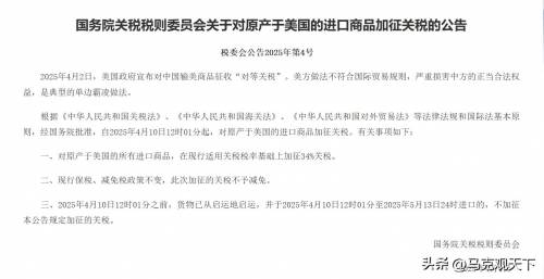 首先,经国务院关税税则委员会公告确认,自4月10日12时01分起,对原产于美国的所有进口商品加征34%关税。从时间和百分比来看,这既是对美国加税的对等回应,同时也给了美国7天的商议时间。