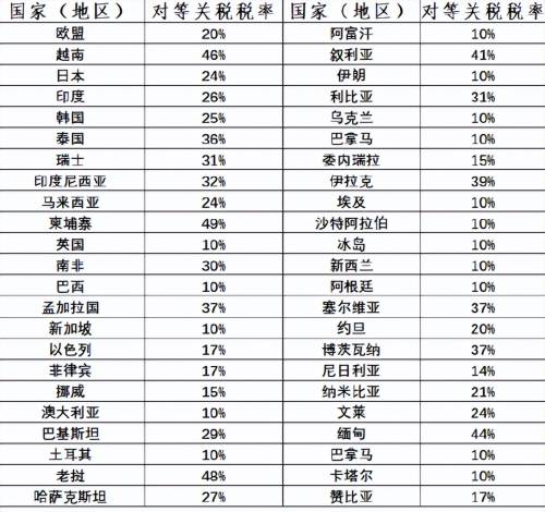 中国位于列表的第一位,在原有基础上加征34%;台湾地区32%;日本24%;韩国25%;印度26%;菲律宾17%;越南46%;柬埔寨49%。