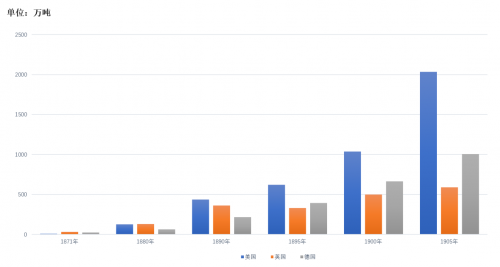 19世纪后期至20世纪初,美英德三国钢铁产量对比数据来源:世界钢铁工业协会数据