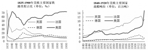 企业运营和组织管理构建了行业运行的微观生态,美国地理和产业大纵深从宏观上拉起了一片广阔场景。就在美国近代钢铁工业起步的1860年,铁路里程已经高达4.9万公里,先于钢铁半个世纪超过了英法德等国的总和,其中九成以上是20年内兴建。